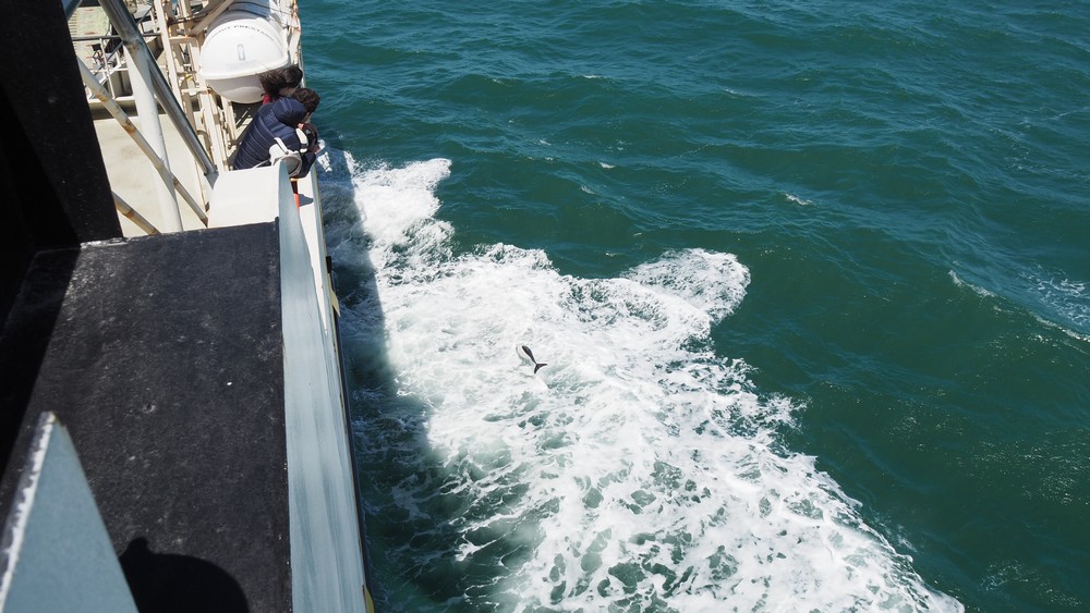 Von der Fähre aus sahen wir Delfine die problemlos mit der Geschwindigkeit der Fähre mithalten konnten.