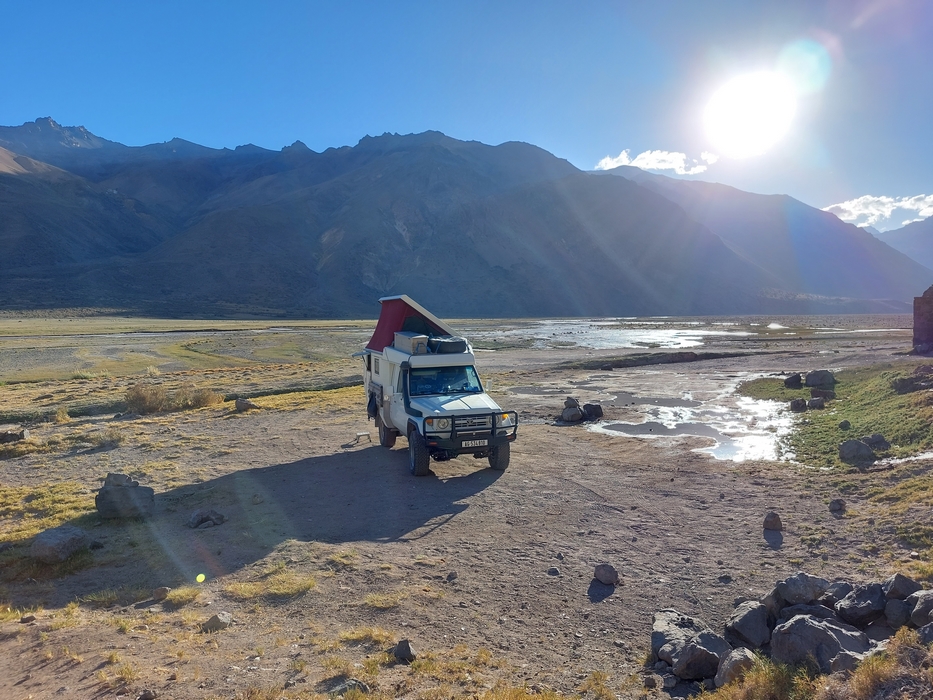 Nach neunstündiger Wartezeit, bis wir am Zoll auf der Passhöhe abgefertigt wurden, fuhren wir nur noch ein kurzes Stück auf ca. 2'500 m ü. M. und haben hier unser Nachtlager eingerichtet.