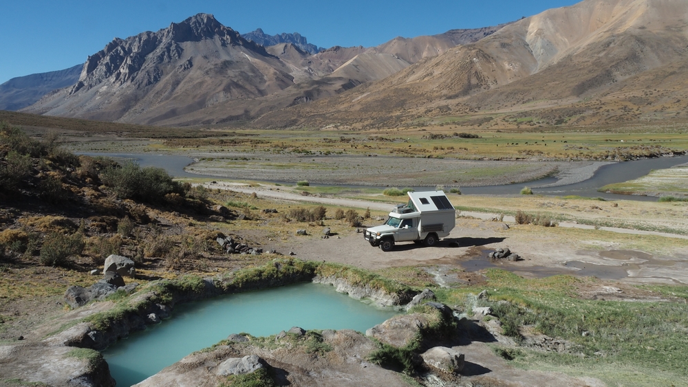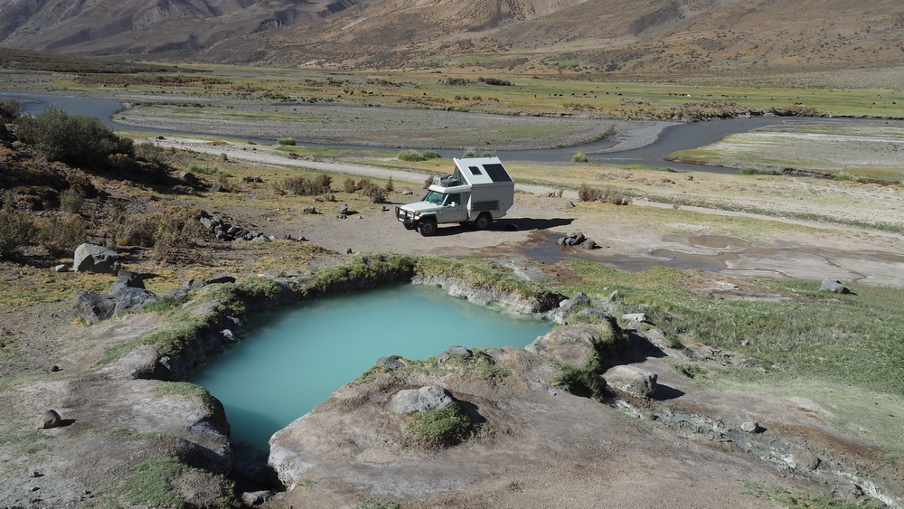 Mitten im Nirgendwo treffen wir auf die Laguna El Sosneado die von einer schwefelhaltigen Quelle gespeist werden. Zuerst kommt man zu einem natürlichen kleinen Pool.
