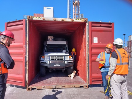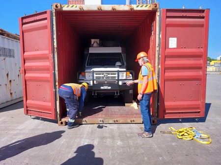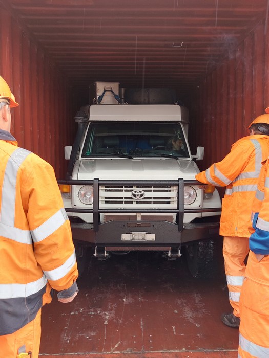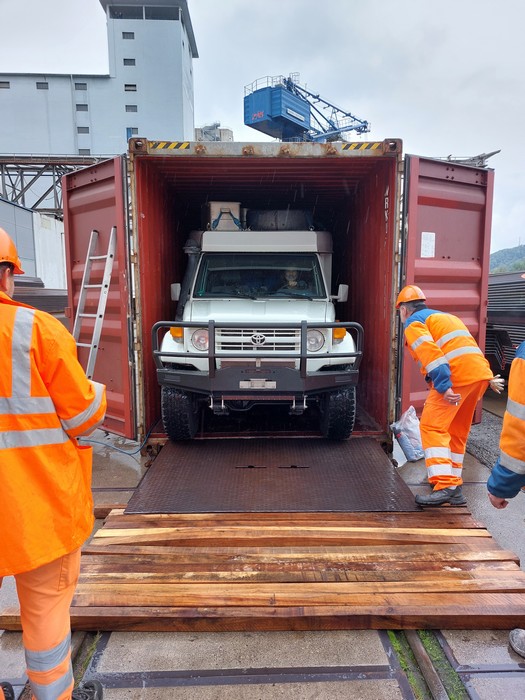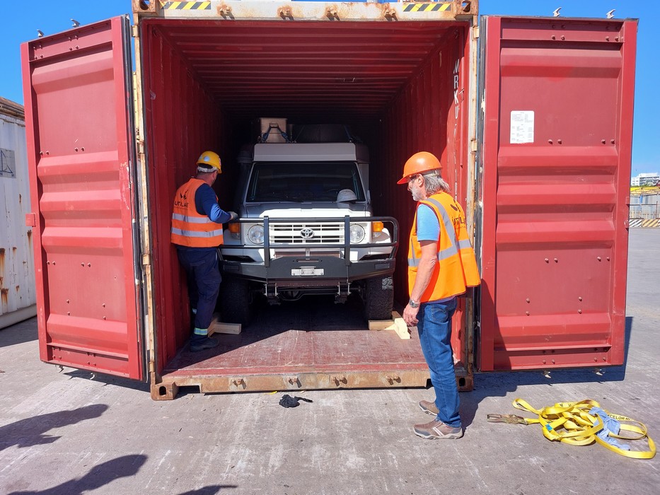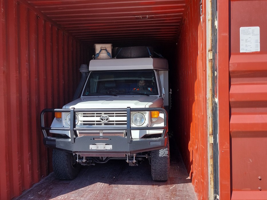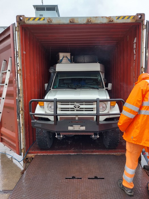 So war es dann auch, die Luft in den Reifen musste vollständig abgelassen werden, damit das Fahrzeug in die Containereingangsöffnung passte.