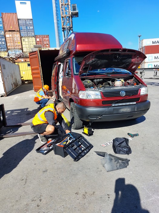 Nun mussten am Fahrzeug die Batterien angeschlossen werden. Es ist Vorschrift, dass an Autos die in einem Container transportiert werden die Batterien abgetrennt werden müssen.